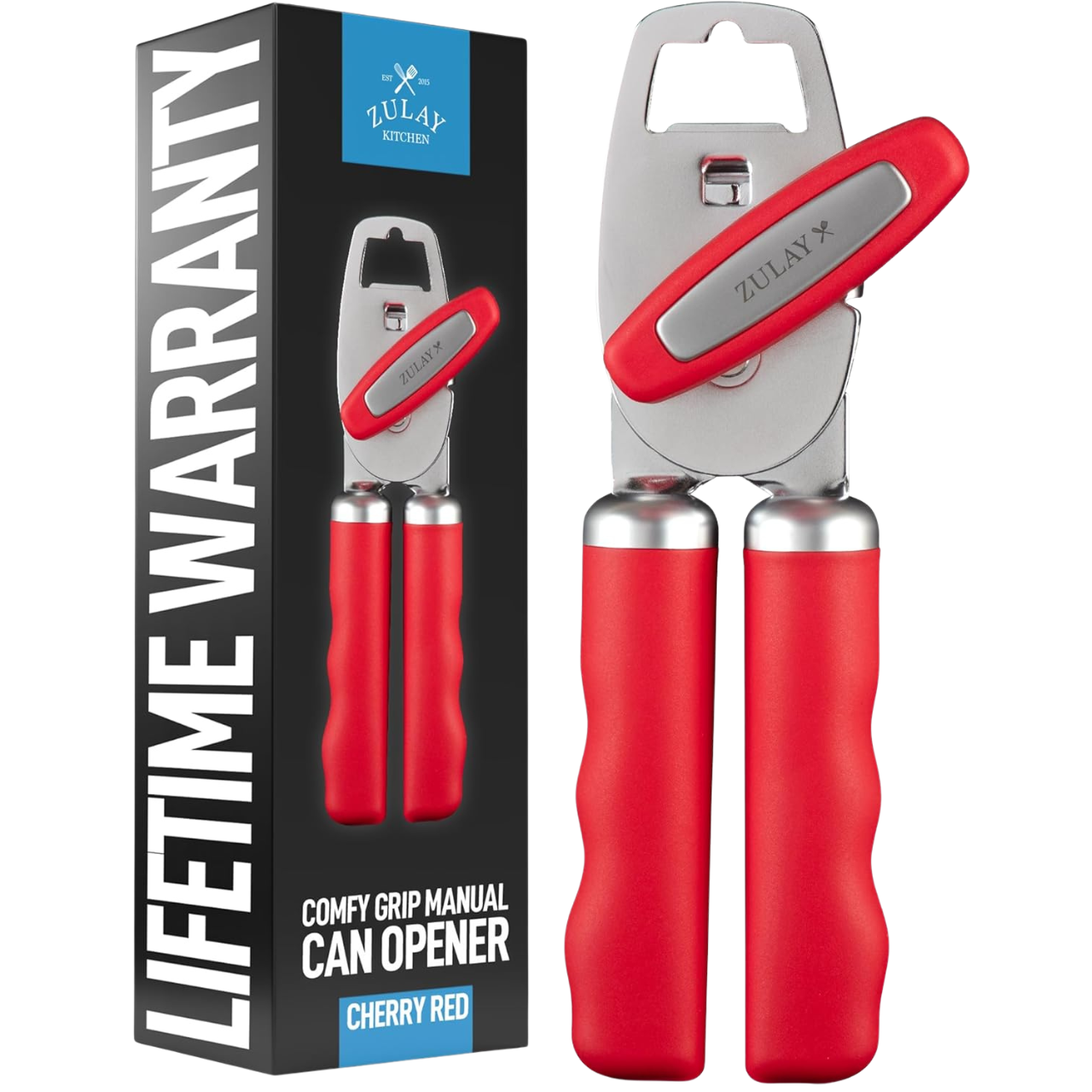 Zulay Kitchen Heavy-Duty Manual Can Opener with Bottle Opener, Ergonomic Soft-Grip Handles, Cherry Red